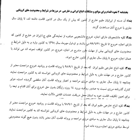 مقررات جدید ورود و خروج ایرانیان مقیم خارج از کشور، دانشجویان و اتباع خارجی مقیم ایران باتوجه به شرایط ناشی از همه گیری کرونا جهت اطلاع در این قسمت قرار داده شده است: